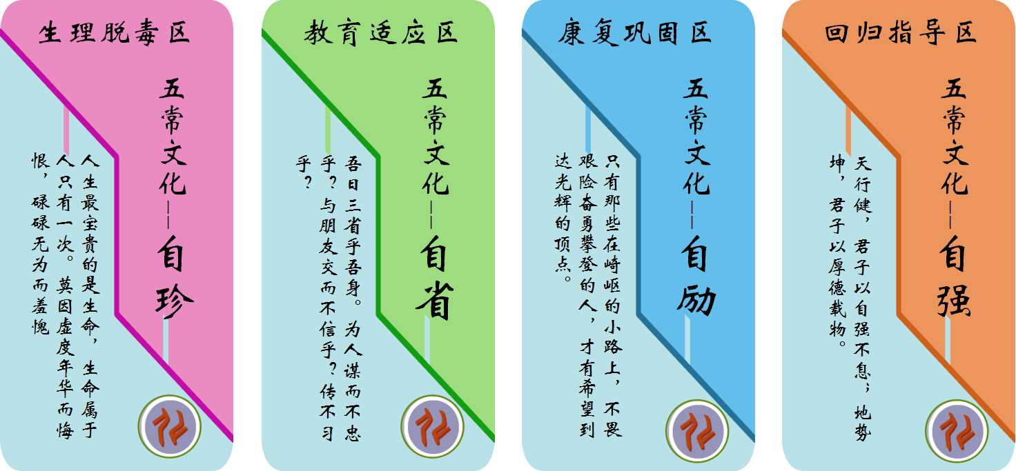 同时,我所还充分发挥优秀传统文化在改变认知、重树人格、戒除毒瘾等方面的独特作用,围绕“四自”(自珍、自省、自励、自强)对应“四区”的外观标识、颜色涂装、内在戒治文化内涵进行统一规划设计,将传统文化“仁、义、礼、智、信”融入戒治全过程。如下图