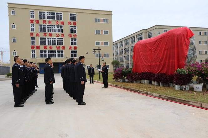 揭牌仪式上,柳城监狱监狱长覃洲和政委梁金才共同为“鼎铉文化石”揭牌。