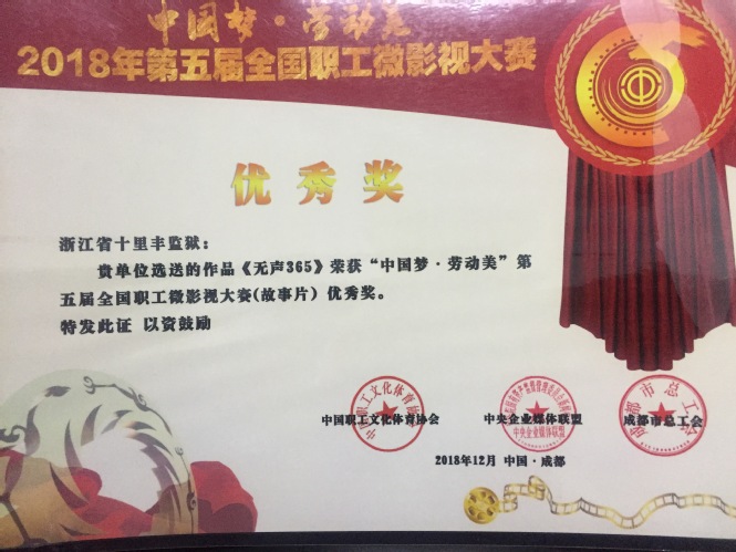 近日,从全国总工会传来好消息,“中国梦·劳动美”2018年第五届全国职工微影视大赛结果揭晓。省十里丰监狱报送的微电影作品《无声365》荣获“优秀故事片奖”。另据悉,2018年中国梦(浙江)网络视频大赛和第五届中国(台州)映山红微电影大赛结果也于近日揭晓,《无声365》分别荣获“提名奖”和“优秀影片奖”,成为浙江监狱系统唯一一部获奖的微电影作品。