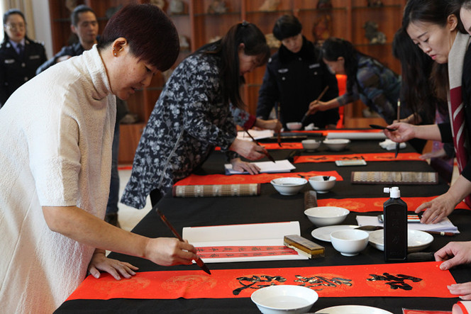 随后,主席团成员现场为场所书写春联,并就春联的写作要求及注意事项与我所民警进行交流,这极大的提高了民警的书写热情,也为场所增添了浓浓的“年味儿”,。