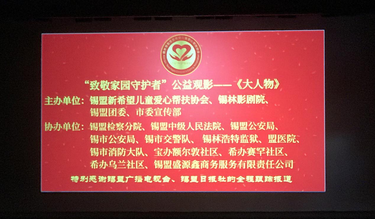 为感谢各政法机关为创建平安锡市做出的突出贡献,锡盟新希望儿童爱心帮扶协会牵头举办了“致敬家园守护者”公益观影活动,锡林浩特监狱积极协办并组织30余名民警职工参加活动。