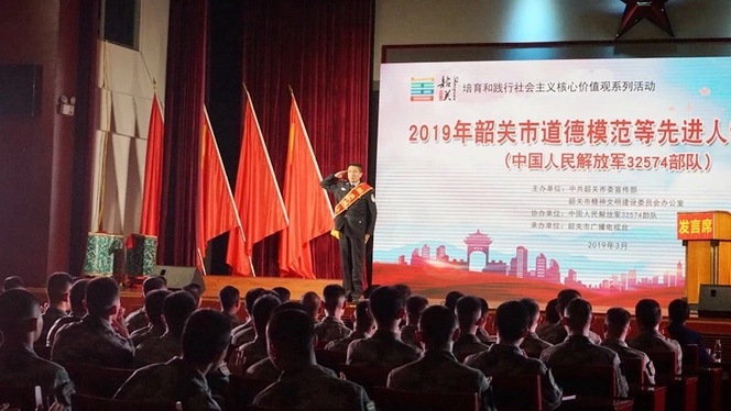 为深入学习贯彻习近平新时代中国特色社会主义思想,积极培育和践行社会主义核心价值观,3月27日晚,由韶关市委宣传部、市文明办共同主办的2019年韶关市道德模范等先进人物巡回宣讲系列活动走进32574部队。其中,韶关监狱四监区科员、团支部书记,2018年“全国监狱工作先进个人”,见义勇为韶关好人李亮同志受到主办方邀请,走进军营用自身体验讲述践行核心价值观的重要意义和促进作用。