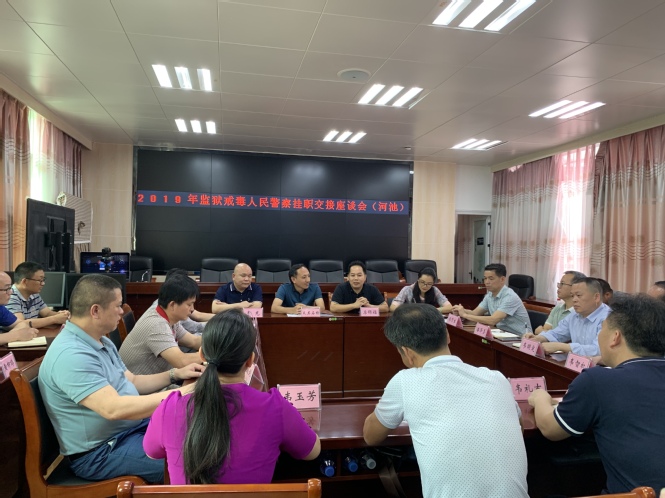 2019年5月14日上午,监狱纪委苏锦福书记带领组织干部科蒙柳屹副科长以及8名挂职警察到河池市司法局报到并参加2019年监狱戒毒人民警察挂职交接座谈会。