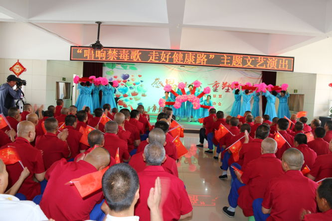 仪式结束后,国际知青网站联盟、中国知青网赤峰联络站所属艺术团125名演员和赤峰市戒毒所干警、戒毒人员共同举办了“唱响戒毒歌、走好健康路”主题文艺演出。这次文艺演出以“拒绝毒品、亲情帮教和健康人生”为中心和主线,内容丰富多彩、形式多种多样,主要有小合唱、独唱、舞蹈、街舞、歌伴舞等。“艺术团”的老同志们,平均年龄约60多岁,年龄最高达76岁,他们既是热心戒毒事业的禁毒志愿者、也是表演水准较高的演员,他们以热心公益的奉献精神、饱满的热情和精湛的演技,表演了精彩纷呈、丰富多彩的文艺节目,赢得了阵阵热烈的掌声和欢呼声,掀起了一个又一个高潮,场面盛大气氛热烈,动人心魄感人至深,有力激发与坚定了广大戒毒人员回应社会关切,坚决拒绝毒品,彻底戒除毒瘾,早日成为新人的信念与决心。