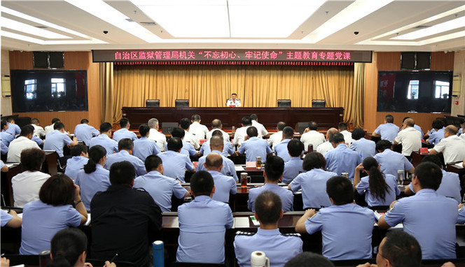 根据中央、自治区党委、司法厅党委关于领导班子成员要在学习、调研基础上讲好专题党课及《自治区监狱管理局党委班子成员讲“不忘初心、牢记使命”主题教育专题党课实施方案》要求,7月23日,自治区司法厅党委副书记、副厅长、巡视员、监狱管理局党委书记、局长范军以“找差距,抓整改,把监狱工作落细落实”为题,为局机关党员、民警职工讲专题党课,解析监狱系统以习近平新时代中国特色社会主义思想为指引、推动工作中存在的差距和改进工作的思路措施。