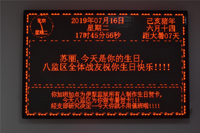 7月16日,八监区一楼的LED屏同往常一样亮着,不同于以往的是屏幕上出现的不是每日工作安排,而是显示着这样一段文字:“苏丽同志,今天是你的生日,八监区全体战友祝你生日快乐!你加班加点为伊犁监狱所有人制作生日贺卡,今天八监区为你做专属贺卡,经支部研究决定,今天你不用值班啦!”。原来是“密谋已久”的生日惊喜,苏丽心情激动地说:“生日年年过,这是最令我难忘的一次生日,谢谢大家对我的祝福,让我感受到八监区这个大集体、大家庭的温暖。”