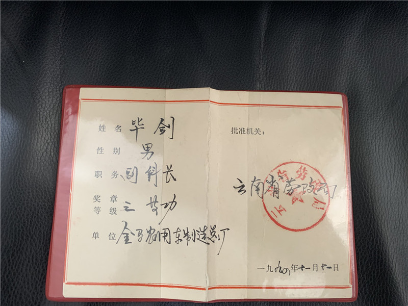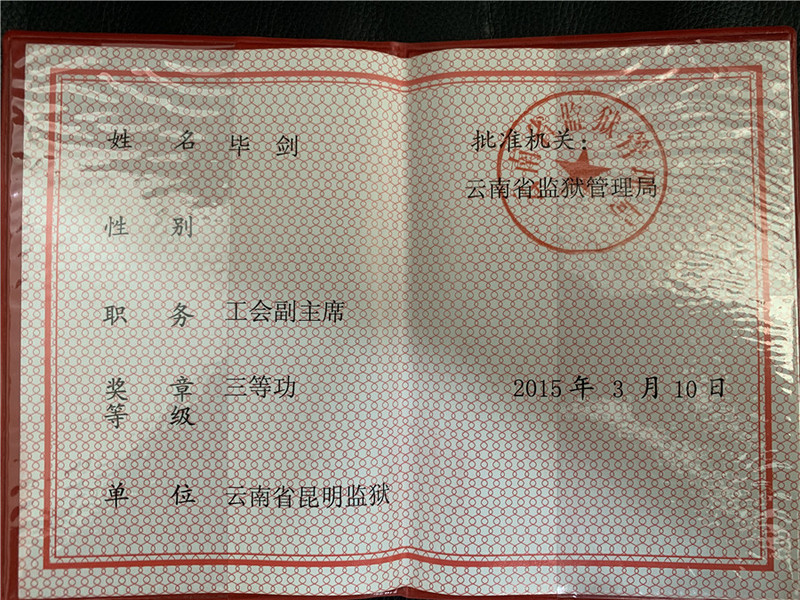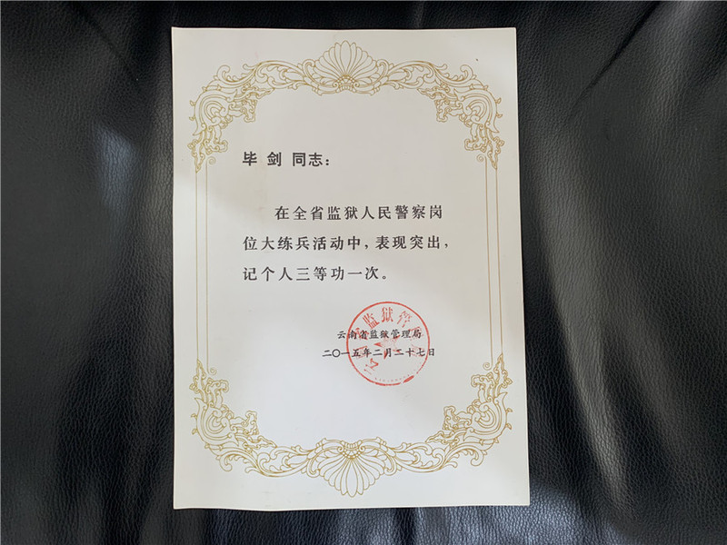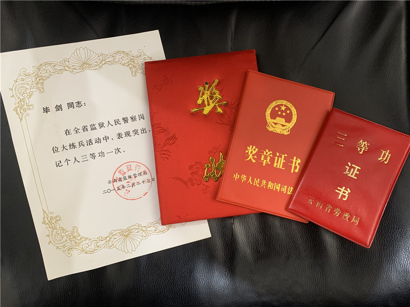 老毕大名叫毕剑,1961年10月1日出生,1980年到昆明监狱工作。从警39年来,荣获优秀共产党员、优秀公务员、从事监狱劳教工作30年证书证章等荣誉称号,先后三次荣立个人三等功。