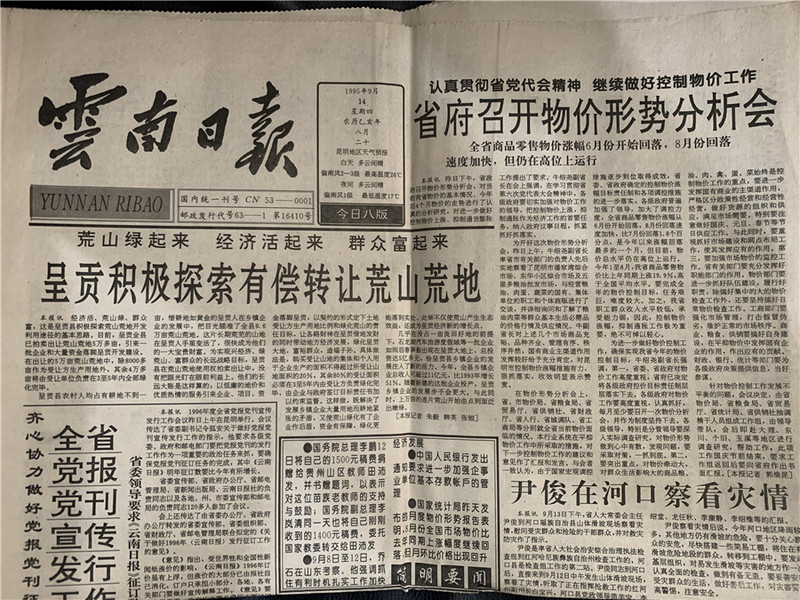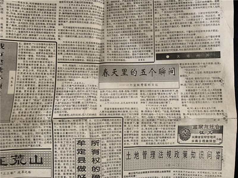老毕是昆明监狱人尽皆知的“才子”,平时爱武文弄墨,闲暇时,写几首小诗,作几篇文章。因为他体型胖,腆着个肚子,大家都打趣说他装了一肚子的墨水。在基层一线时,罪犯教育大会上的稿子是他写的,到了离退办,老同志们爱看的报纸《常青树》是他编的。1995年,老毕的文章《春天里的五个瞬间——一个监狱警察的日记》获得省监狱管理局、《云南日报》编辑部有奖征文二等奖,并在当年9月14日第三版上刊发。这张报纸老毕视若珍宝,一直珍藏着。翻开已经泛黄的报纸,老毕当年的风采跃然纸上。