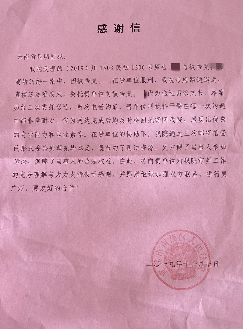 11月20日,昆明监狱收到了一封来自四川南溪区法院的信,信中写道:“......本案历经三次委托送达,数次电话沟通,贵单位刑执科干警在每一次沟通中都非常耐心,代为送达完成后均及时将回执寄回我院,展现出优秀的专业能力和职业素养。在贵单位的协助下,我院既节约了司法资源,又方便了当事人参加诉讼,保障了当事人的合法权益。在此,特向贵单位对我院审判工作的充分理解与大力支持表示感谢,并愿意继续加强双方联系,进行更广泛、更友好的合作!”短短数语,既有对监狱刑罚执行科警察职业素养的褒奖,也有对监狱支持基层法院工作的肯定。