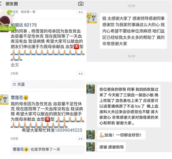 10日晚上,民警杨雪莲的母亲突发性消化道出血,导致失血性贫血休克,在医学院第一附属医院住院,急需输入大量A型血救治。但当天医院没有充足的A型血供给,杨雪莲和父亲又因血型不符无法献血,万般无奈下她向朋友圈发起“求助”,“母亲因失血休克,急需A型血,希望相同血型的您能够伸出援助之手,万分感谢!急扩散!”
