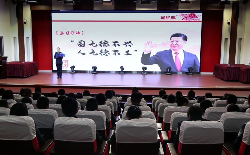 道德讲堂分为“唱歌曲、看短片、学榜样、谈感悟、诵经典、送祝福”六个环节。活动在听唱歌曲《如雪无声》里拉开帷幕,随后,在“看短片”环节,大家观看了《榜样4—黄文秀》,黄文秀同志的先进事迹为我们广大党员干部竖立起了一面精神旗帜,时刻激励着我们奋力走好新时代的长征路。在“学榜样”环节,主持人带领大家一起学习了“时代楷模”朱有勇先进事迹,朱有勇同志是继杨善洲、高德荣之后的又一全国重大先进典型,是我们身边最直接、最现实、最生动的学习榜样。在“谈感悟”环节,在场警察踊跃发言,纷纷表示要以黄文秀、朱有勇等一批优秀共产党员为学习的榜样和标杆,不忘初心,牢记使命,务实担当,为党的监狱事业作出自己应有的贡献。在“诵经典”环节,主持人带领大家反复诵读经典名句“国无德不兴,人无德不立”,这句话强调“道德”是做人的根本,同时还启示了精神力量对于一个国家,一个民族的重要性,使大家深刻认识和理解了道德对于个人修身立业和国家长治久安的重要作用。到“送祝福”环节,党委委员、政治处主任和文军和大家共同分享了古文名句——“知是行之始,行是知之成”,并引用习近平总书记学以致用和崇尚实践的“知行合一”观,激励全体警察职工牢记初心使命,在“知行合一”中主动担当作为,做起而行之的行动者,做新时代最美奋斗者!