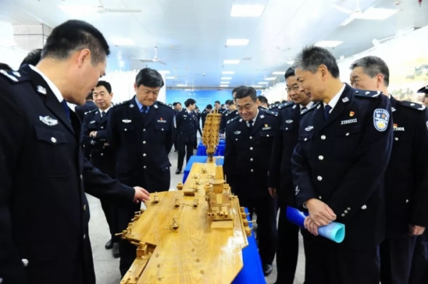 “你看这个航母太逼真,连上面的飞机、雷达、锚、动力桨等等都雕刻得那么细致,简直就是‘辽宁舰’的再现!”在罪犯创意作品展区,大家围着木雕航母模型展开了交流。