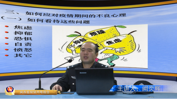 在讲座中,监狱心理咨询师针对封监管理期间容易产生的心理问题,教授罪犯从修正认知、采取有效行为、正确处理情绪等方面进行心理调节,积极面对疫情。