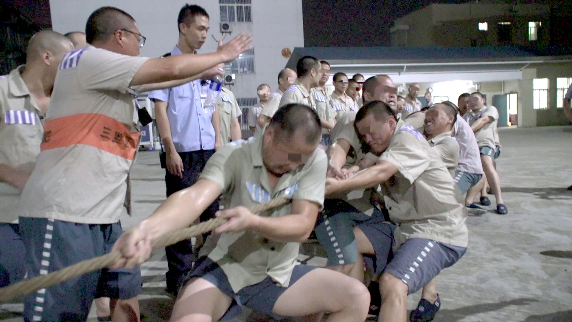 夜间教育期间组织罪犯拔河比赛