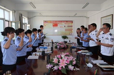 全体党员警察与支部签订承诺书,在党支部书记的带领下,面对党旗做出庄重承诺:“增强纪律意识,强化纪律规矩,维护监狱人民警察良好形象,做到遵守“十个严禁”,承诺铿锵有力掷地有声。
