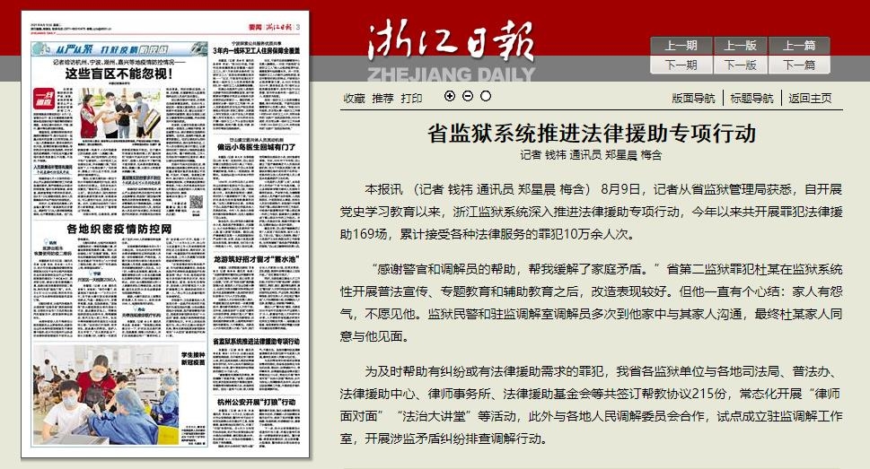 党史学习教育开展以来,浙江监狱系统结合工作实际,坚持刑事司法程序末端和社会治理前端的职能定位,以法律援助专项行动为载体,持续推进“我为罪犯解心结”活动,促进监管安全稳定,确保“三为”专题实践活动走深走实。据统计,今年以来共开展罪犯法律援助169场,累计接受各种法律服务的罪犯10万余人次;全省501名对判决存在异议的罪犯,通过专项行动,有324名罪犯表示认可法院判决。