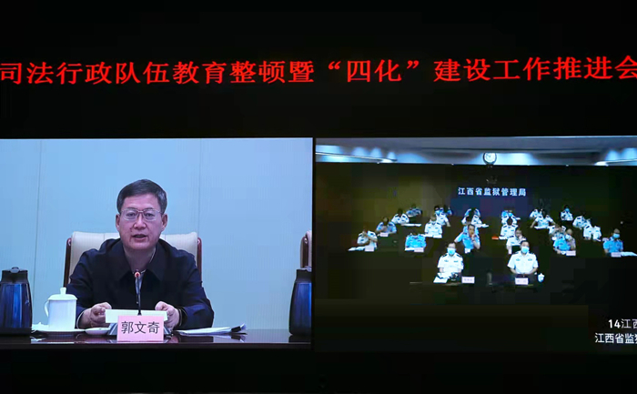 郭文奇强调,要全面贯彻落实习近平总书记关于“要加快推进政法队伍革命化、正规化、专业化、职业化建设”的重要指示和关于开展政法队伍教育整顿的重要指示精神,大力加强队伍思想政治、履职能力、纪律作风建设,努力建设一支信念坚定、执法为民、敢于担当、清正廉洁的司法行政队伍。要切实做到“五个进一步强化”,进一步强化政治统领、党建引领,不断深化对司法行政队伍建设工作的规律性认识;进一步强化学习贯彻习近平新时代中国特色社会主义思想,准确把握司法行政队伍建设的重要性、紧迫性和总要求;进一步强化“四化”建设要求,着力打造党和人民信得过、靠得住、能放心的司法行政铁军;进一步强化全面从严管党治警,切实增强开展队伍教育整顿的政治自觉思想自觉行动自觉;进一步强化工作任务落实,不断开创新时代司法行政队伍建设工作新局面。