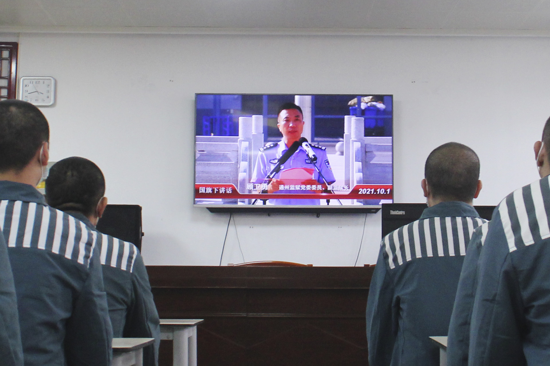 一监区教导员顾卫钟介绍说:“国庆期间,监狱组织罪犯观看学习爱国主义教育视频,把生动鲜活的党史故事讲给每一名罪犯听,收到了很好的教育效果。”