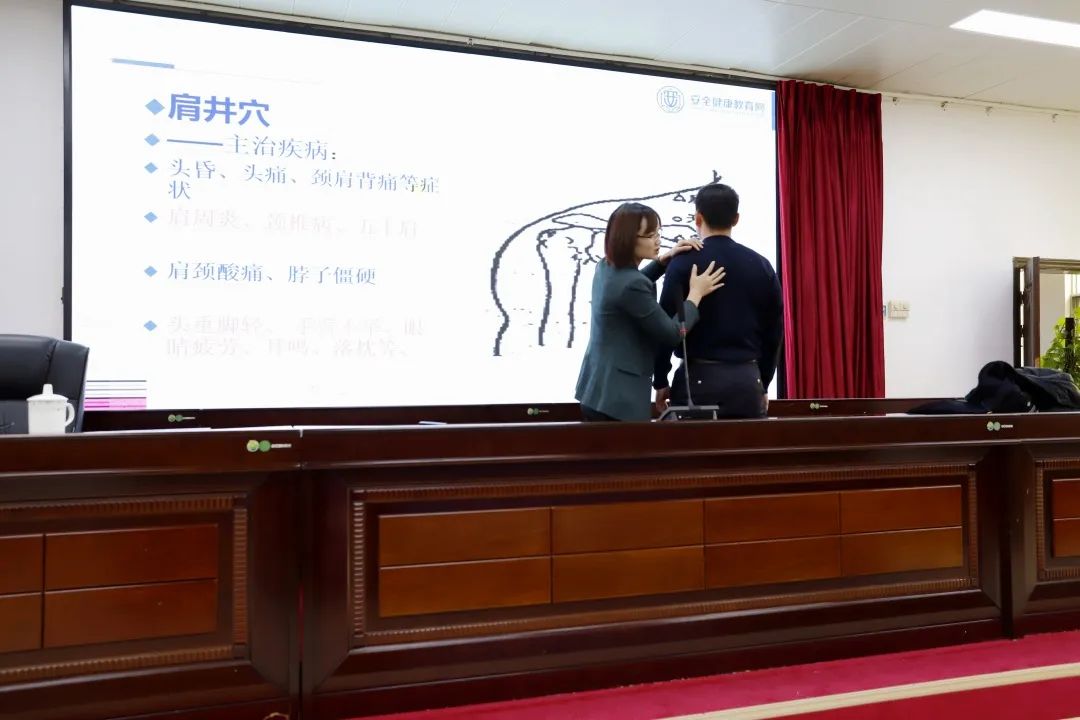 在实操环节,韦桂星为大家介绍人体穴位的按压步骤,列举对生命健康安全造成隐患的因素,呼吁大家加强疾病的预防,养成良好的生活和饮食习惯,定期进行体检。